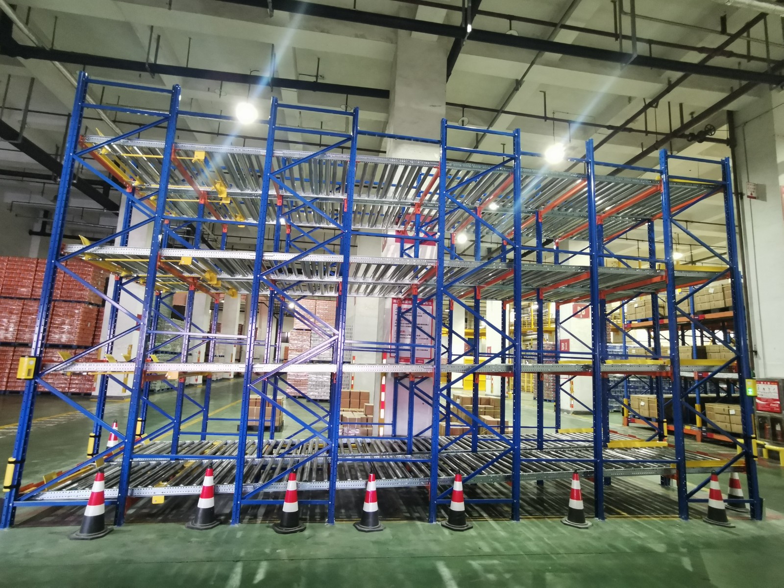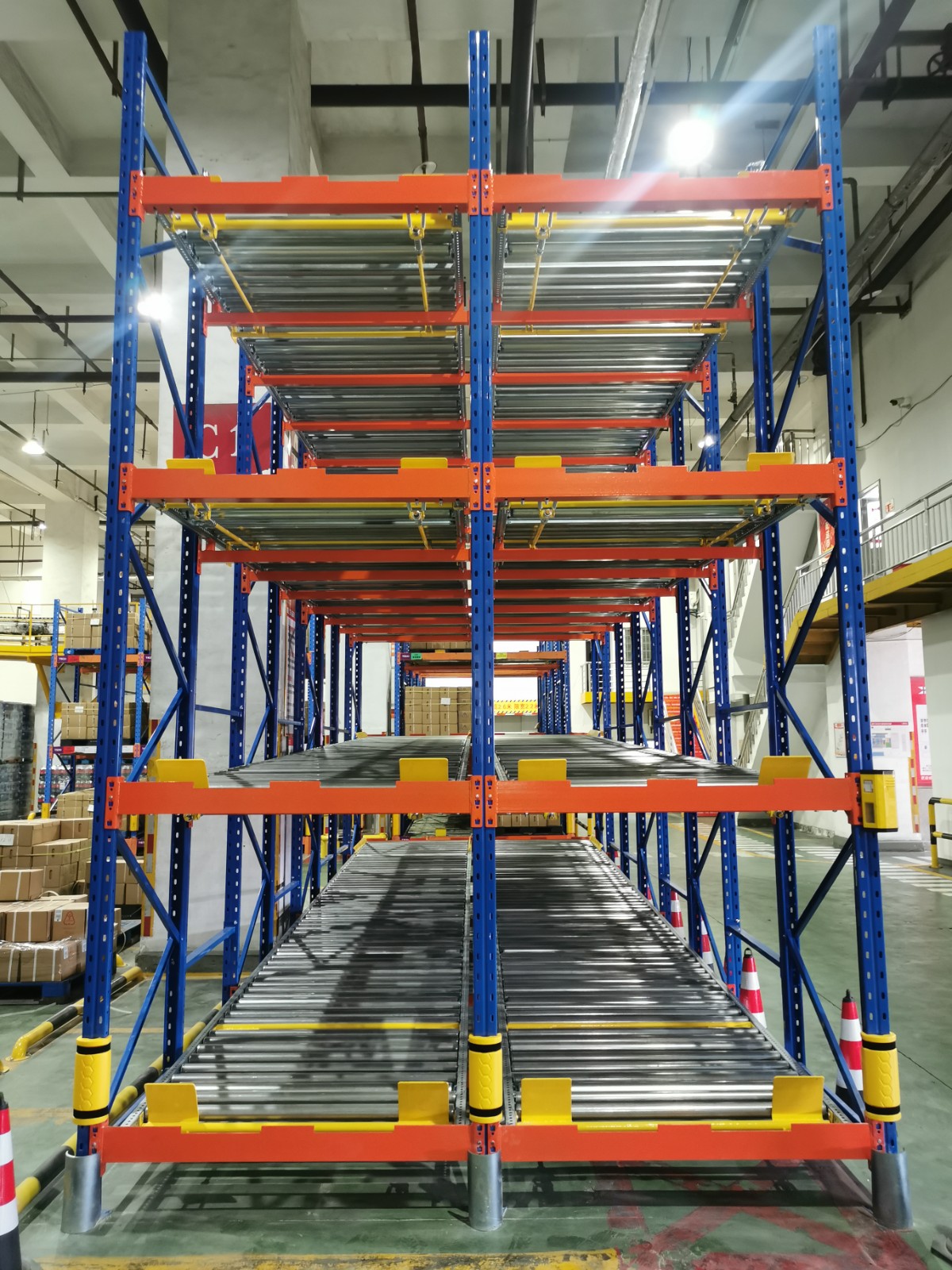重力式货架是一种靠重力作用把物品滑动到取货口的货架,不仅节约仓库面积,还能实现先进先出的效果,它利用了货物自重的特性,在货架的较高的一侧装有滑道,货物依靠自身重力自动向下移动,直到到达托盘另一侧的取货口处,达到了快捷、安全的取货效果。